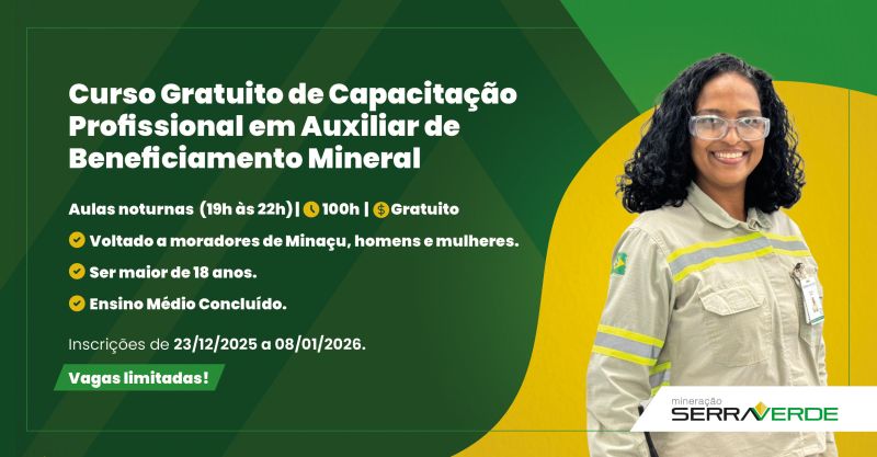 A Mineração Serra Verde, em parceria com o SENAI Minaçu, está oferecendo curso GRATUITO de Capacitação Profissional para a comunidade de Minaçu!
