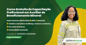A Mineração Serra Verde, em parceria com o SENAI Minaçu, está oferecendo curso GRATUITO de Capacitação Profissional para a comunidade de Minaçu! Oportunidade disponível: –